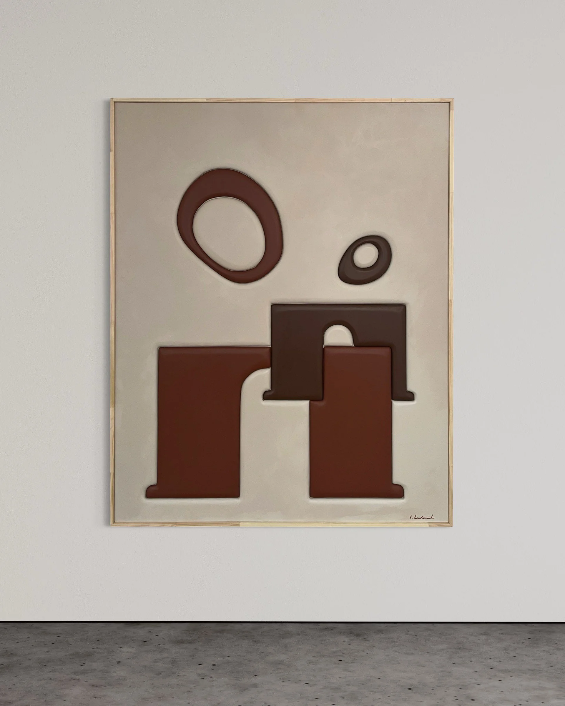 Parent & Enfant se compose de tons chauds et profonds, associés à un camaïeu de crèmes qui instaurent une atmosphère de calme et de tendresse. Les formes simples et massives dialoguent entre elles, suggérant deux présences liées par un geste protecteur et enveloppant. Les volumes imbriqués évoquent la transmission, le soutien et la continuité.